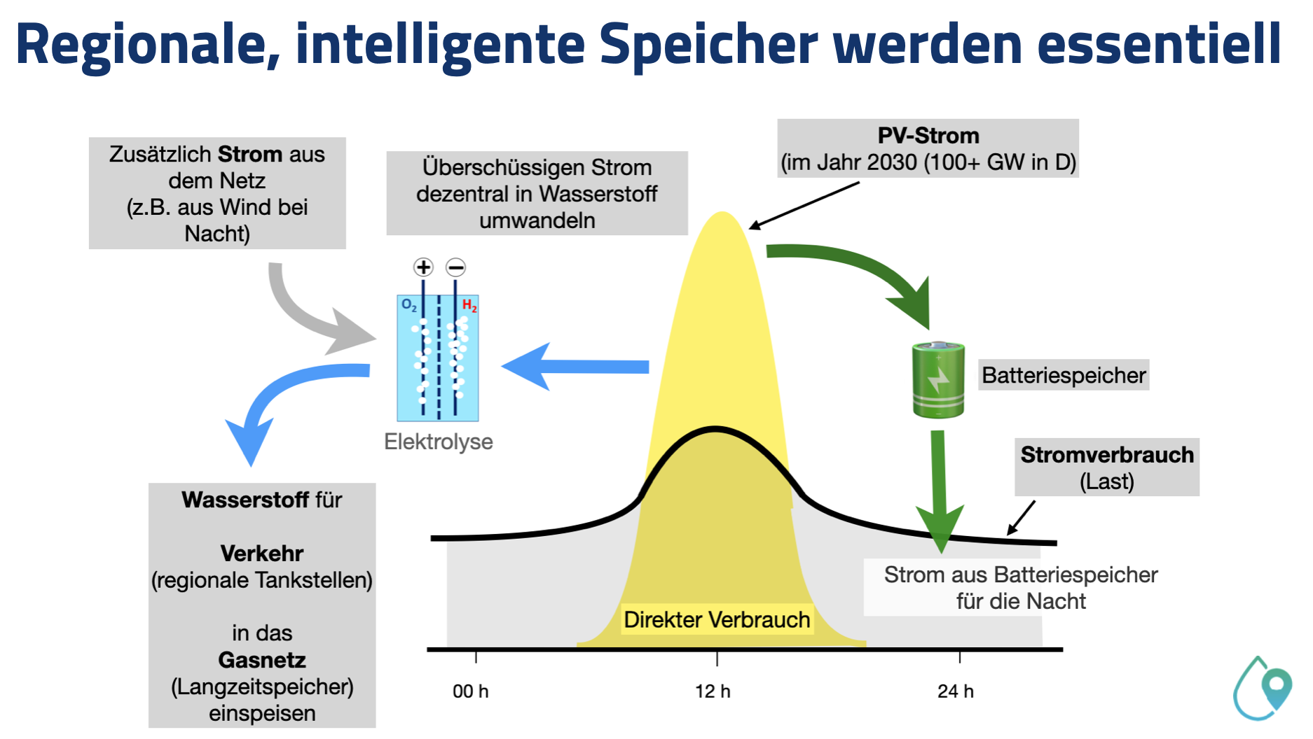 Heute sind in Deutschland etwa 5 Gigawattstunden an Batteriespeicher installiert. Im Jahr 2030 – das ist nicht mehr weit weg – brauchen wir etwa 500 Gigawattstunden Speicher für den dann in Deutschland zu viel produzierten Strom. Da wird die Speicherung des Stromes in Form von Wasserstoff immer wichtiger. Wie das gehen kann, zeigt die folgenden Grafik: