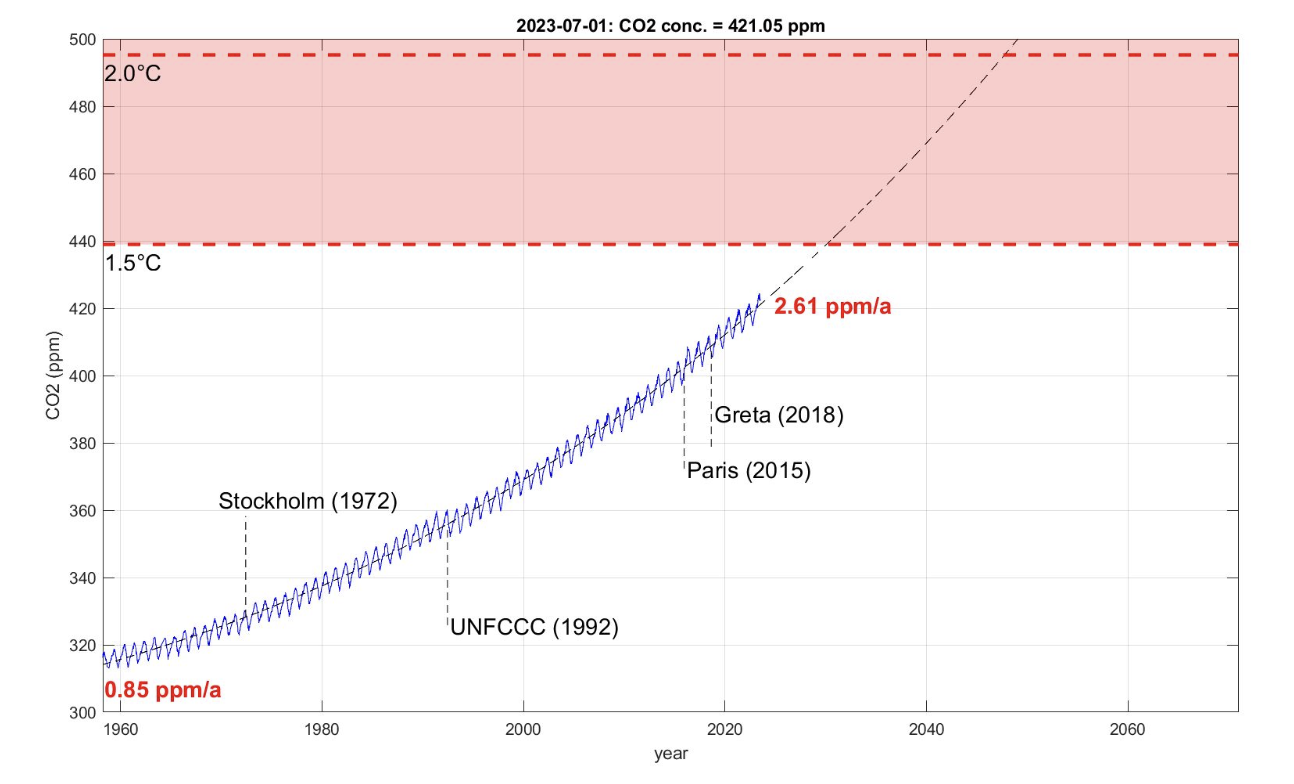 Es gab viele weitere, internationale Treffen und noch mehr dramatische Appelle – aber die Emission der Klimagase hat sich in den nun fast acht Jahren kontinuierlich weiter nach oben bewegt – ganz anders als vereinbart.
