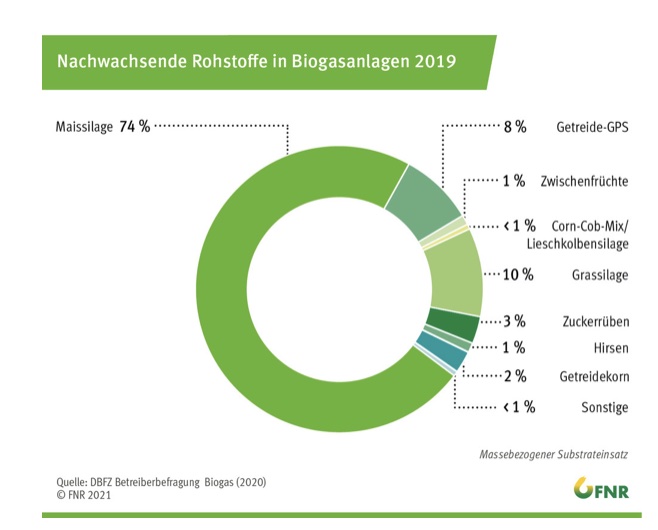 Die Fachagentur Nachwachsende Rohstoffe e. V. (FNR) ist da sehr hilfreich. Wie die folgende Grafik zeigt, kommen etwa jeweils die Hälfte aus den sogenannten nachwachsenden Rohstoffen und aus Gülle bzw. Mist.