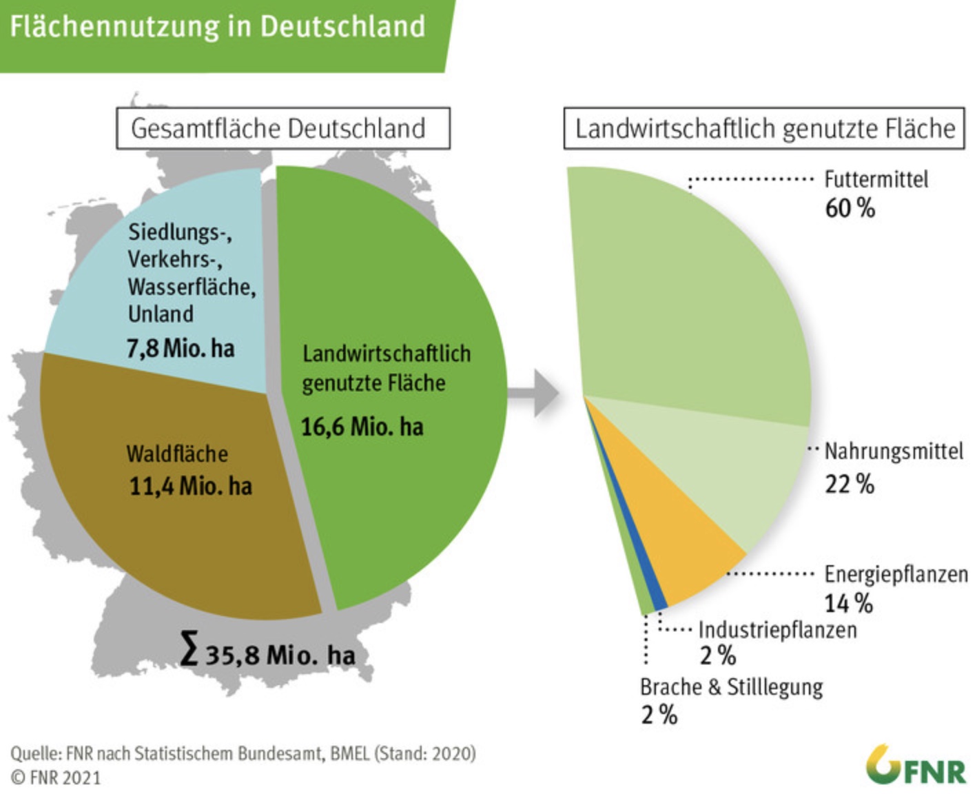 Dazu eine kleine Rechnung: Energiepflanzen wachsen auf 2,3 Millionen Hektar Land (siehe Grafik des FNR unten; das sind primär Mais für die Biogasanlagen, sowie Weizen/Zuckerrüben für Ethanol im E 10 Benzin und Rapsöl für Biodiesel).