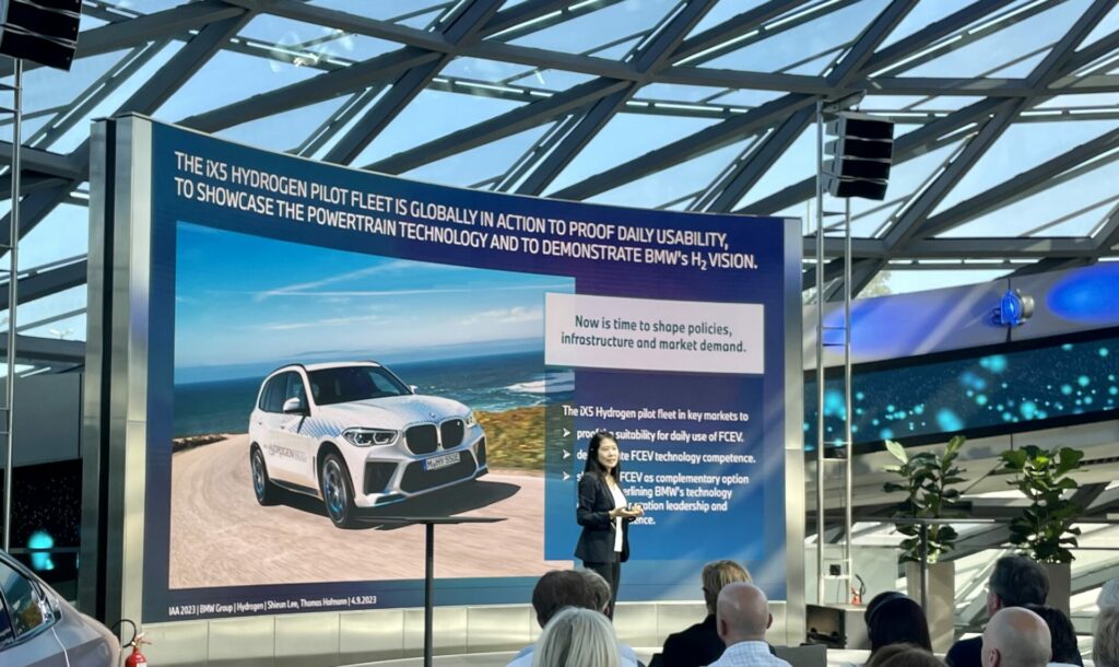 Am IAA-Stand von BMW, mehr noch beim Vortrag zu den Plänen bzgl. des iX5 – Wasserstoff-PKWs – hörte es sich durchaus so an, als plane die Firma tatsächlich, ihre Fahrzeugflotte um die bisherige „Hydrogen Pilotflotte“ zu ergänzen. Mehr noch: Man hat vor, sich gleichermaßen um das bisherige Hemmnis – nämlich ausreichend viele H2-Tankstellen – zu kümmern. Dies sollen Partnerschaften mit entsprechenden Groß-Lieferanten sicherstellen.