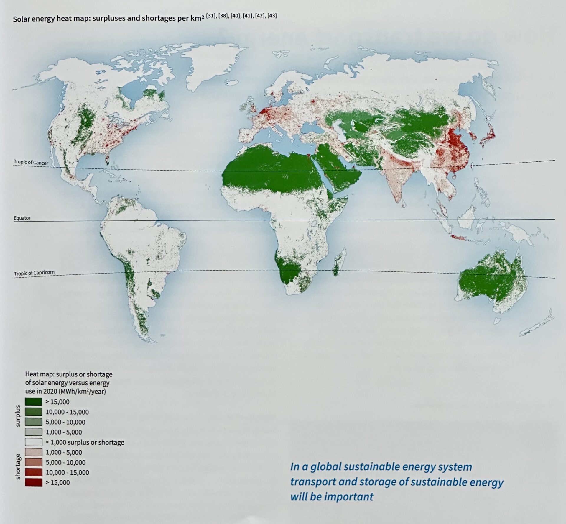 Eine der vielen gelungenen Darstellungen aus dem Buch ist die Darstellung des Überschusses und des Mangels an Sonnenenergie im Vergleich zum Energiebedarf. Während die dicht besiedelten Gebiete einen erheblichen Mangel an verfügbarer Sonnenenergie aufweisen, haben die riesigen Wüstengebiete einen enormen Überschuss und könnten ein Vielfaches des weltweit benötigten Energiebedarfes decken. Aber wie kommt die Energie aus den fernen Wüsten in unsere Region mit ihrem hohem Energiebedarf?