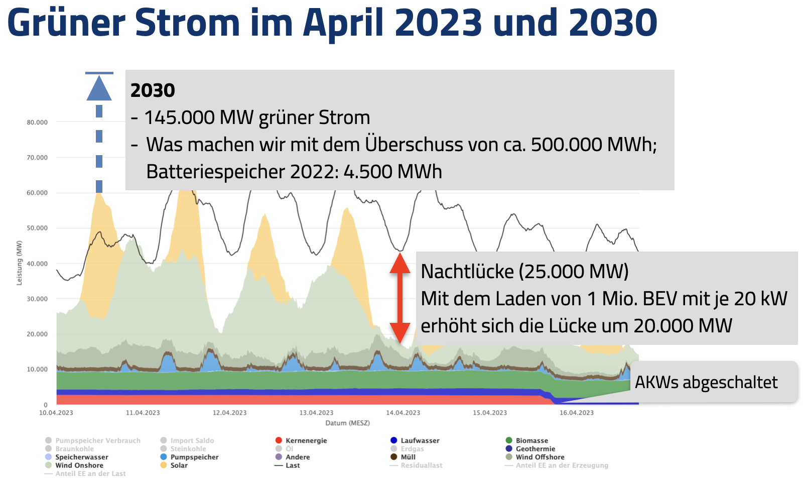 Tagsüber und besonders bei sonnigem Wetter wird es nicht viel mehr sein als heute. Da wird dann ziemlich oft sehr viel Strom übrig bleiben, und der muss gespeichert werden. Nachts jedoch, wenn die meisten Batterie-Fahrzeuge geladen werden und im kalten Winterhalbjahr die Wärmepumpen laufen, dann wird der Verbrauch deutlich steigen.