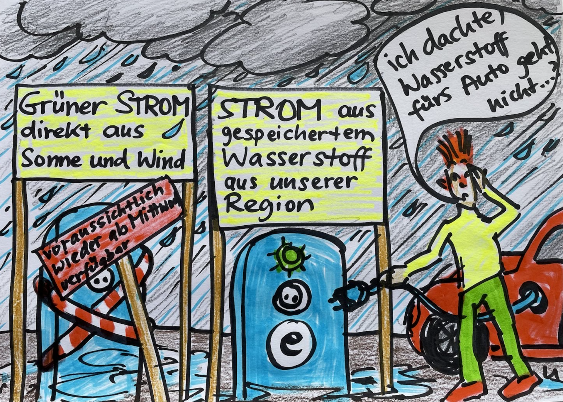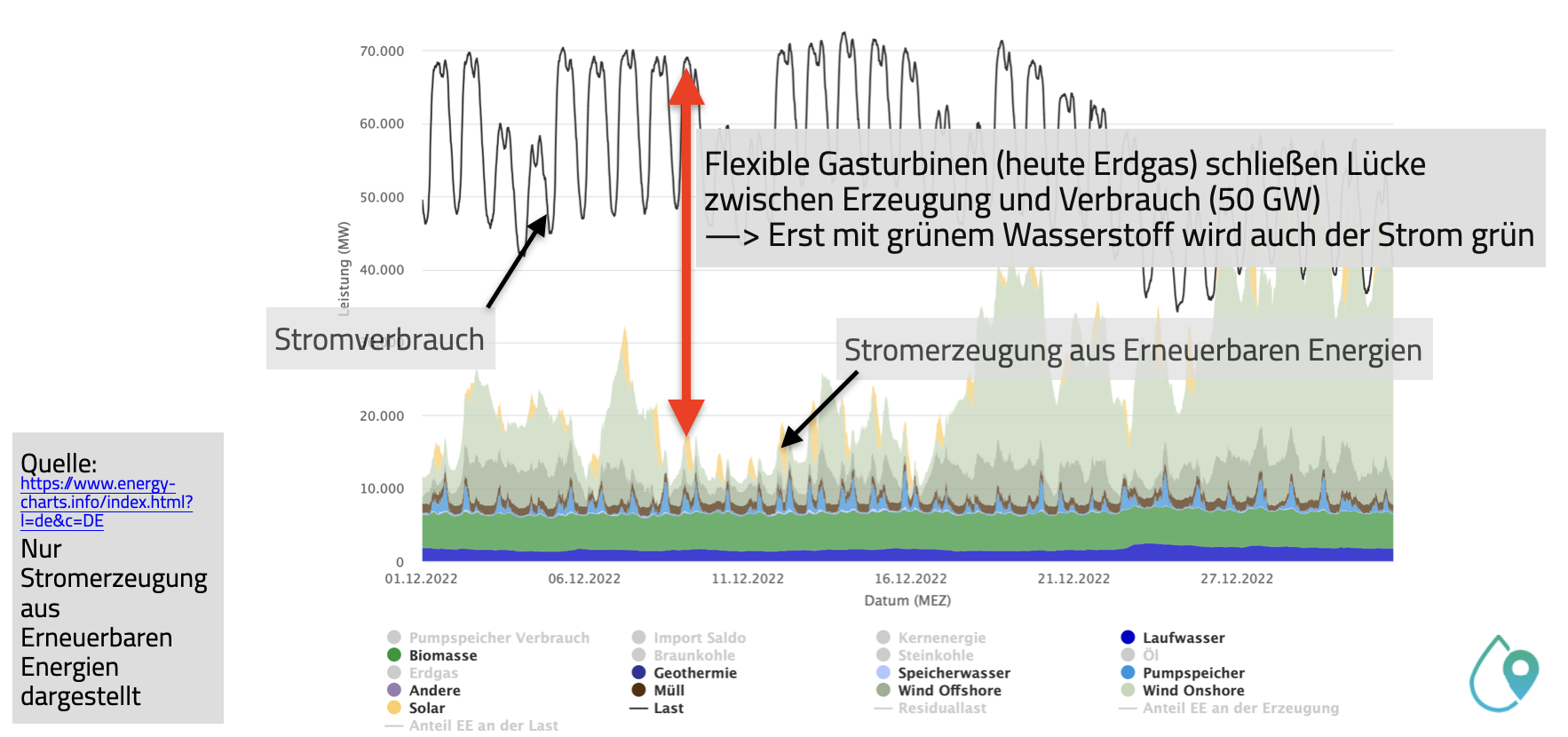 Damit können dann – wenn die Wasserstoff-Kraftwerke in Betrieb sind – endlich auch Batterie-E-Fahrzeuge und Wärmepumpen klimafreundlich werden.