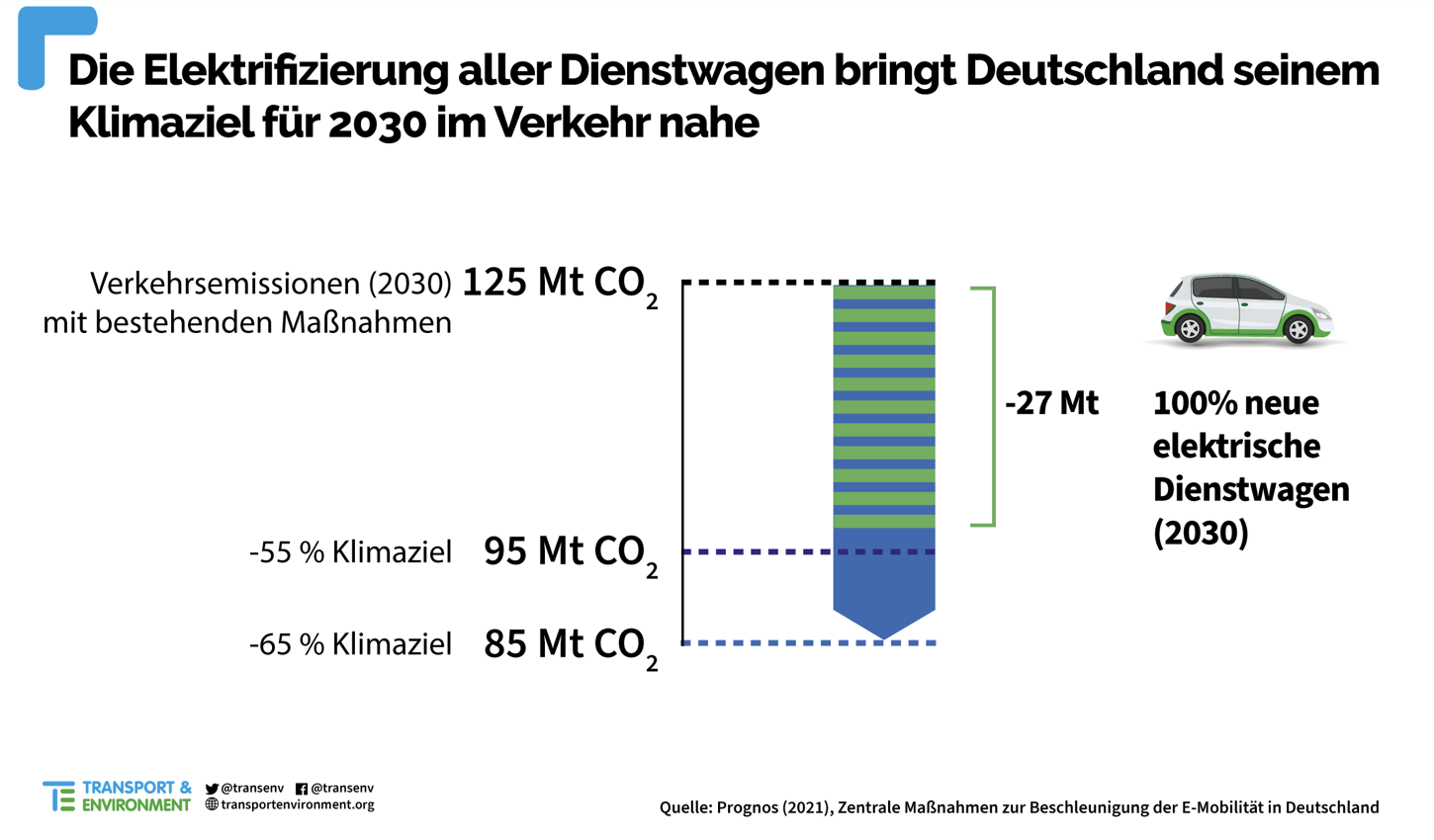 Laut einer Studie von Transport & Environment (T&E) könnte der gesamte CO2-Ausstoß von PKWs um fast ein Drittel reduziert werden, wenn die betroffenen Firmen bis 2030 nur noch E-Autos anschaffen würden. Bisher beträgt deren Anteil bei neuen Dienst- und Gewerbefahrzeugen allerdings erst 5,5 Prozent. Doch bei deren durchschnittlichen CO2-Emissionen steht Deutschland mit 157 g pro Kilometer in Europa unangefochten auf Platz 1.