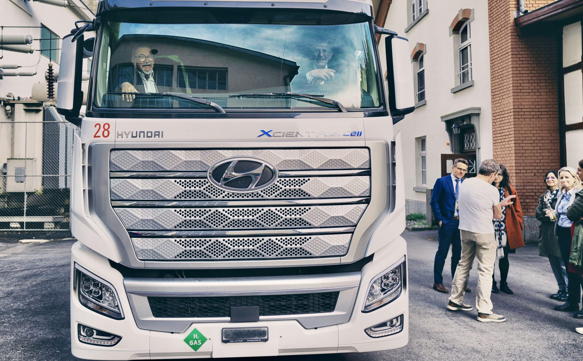 Titelbild: Winfried Hamann und Werner Tillmetz als „H2-Trucker“ beim Besuch der Wasserstoffproduktionsanlage am Kraftwerk Kubel bei St. Gallen