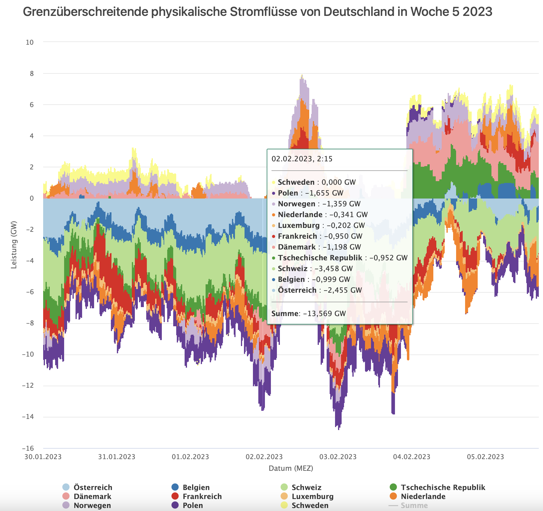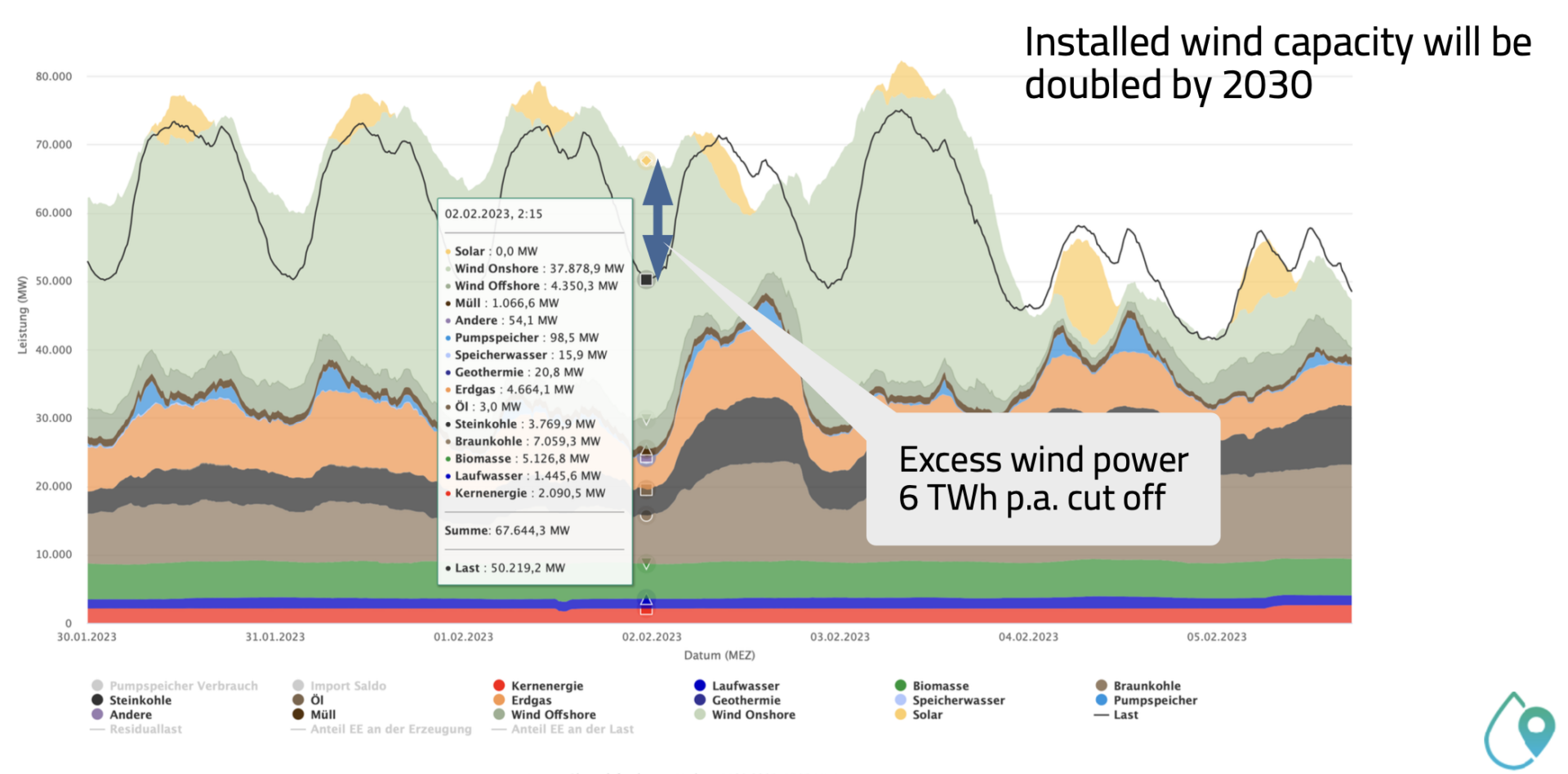 Für die Freunde von Fakten und Grafiken, hier das Beispiel der Stromversorgung in der windreichen Woche vom 30.1. bis zum 5.2.23. Wenn die installierte Kapazität an Windkraft in den nächsten Jahre verdoppelt wird, dann werden die Stromüberschüsse, die man speichern muss, so richtig groß.