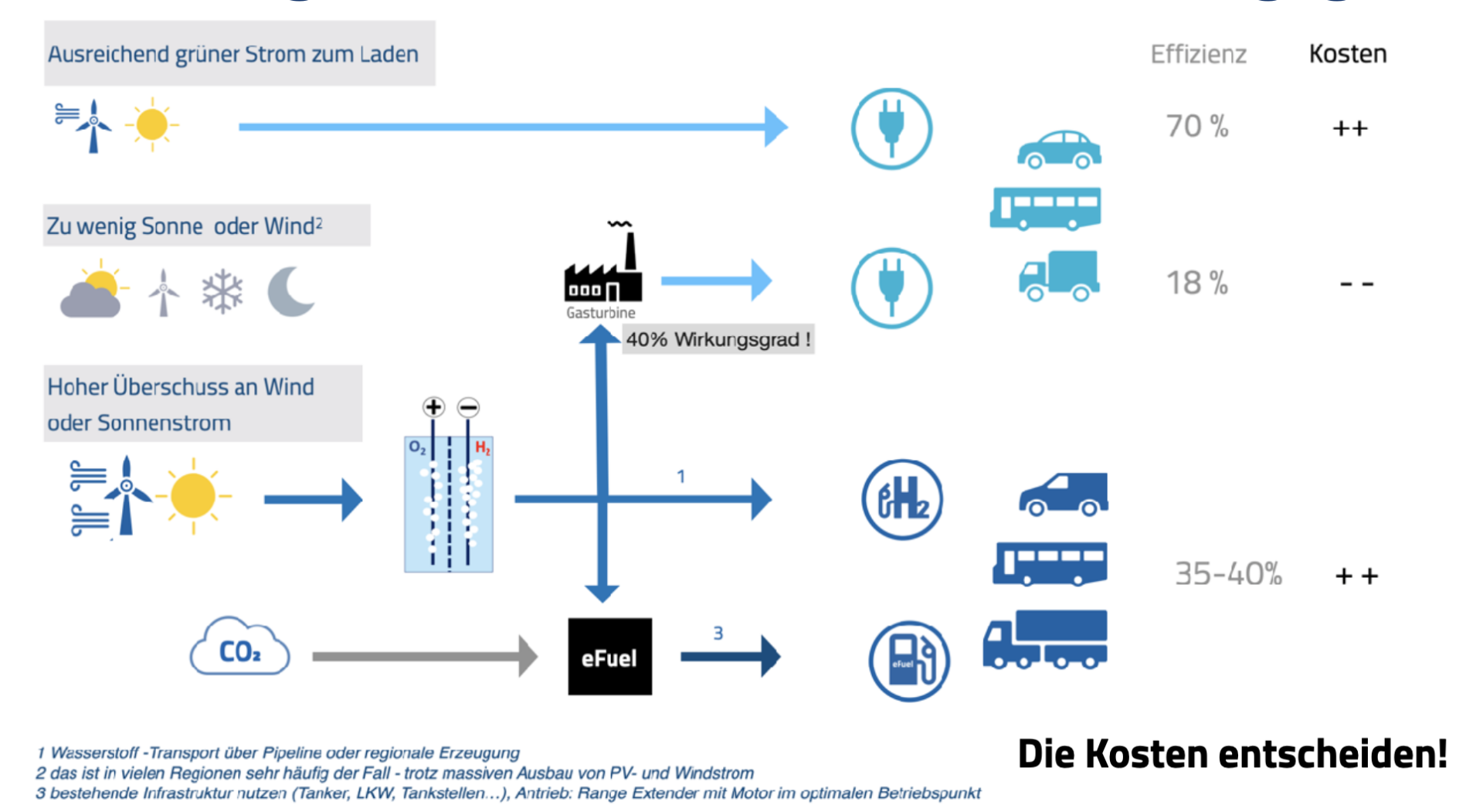 Kommt der Strom zum Laden jedoch aus eine Gasturbine (heute Erdgas, morgen Wasserstoff), dann stellt das die Wirkungsgradbetrachtung auf den Kopf: der Batterie-elektrische Antrieb hat dann statt 70 Prozent nur noch einen Wirkungsgrad von 18 Prozent (siehe Grafik unten).
