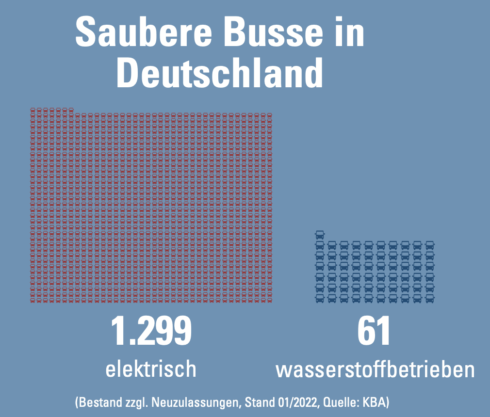 Inzwischen sind 1299 batterieelektrische und 61 Wasserstoff-Busse in Deutschland im Einsatz. Das ist ein sehr guter Start, zeigt aber auch, dass es noch ein langer Weg ist, um die restlichen 79.000 Busse klimafreundlich und sauber zu machen.