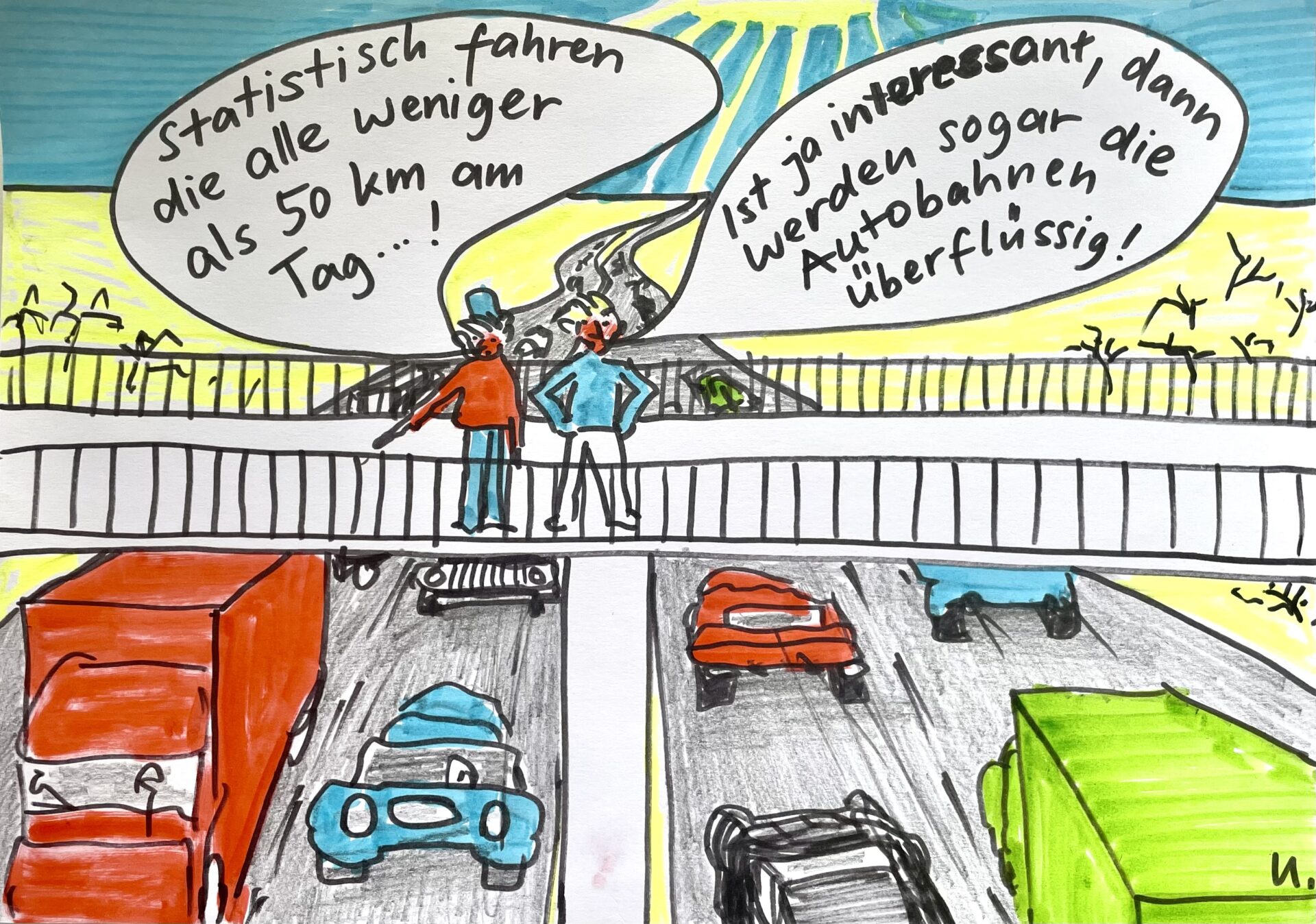 Das mit der durchschnittlichen, täglichen Fahrstrecke ist zwar richtig. Aber was bedeutet das? Wenn wir alle täglich weniger als 50 Kilometer am Tag fahren, stellt sich z.B. die Frage nach dem Sinn von Autobahnen (siehe Titelbild). Doch der größte Teil der PKW auf Autobahnen ist sicherlich sehr viel weiter unterwegs.