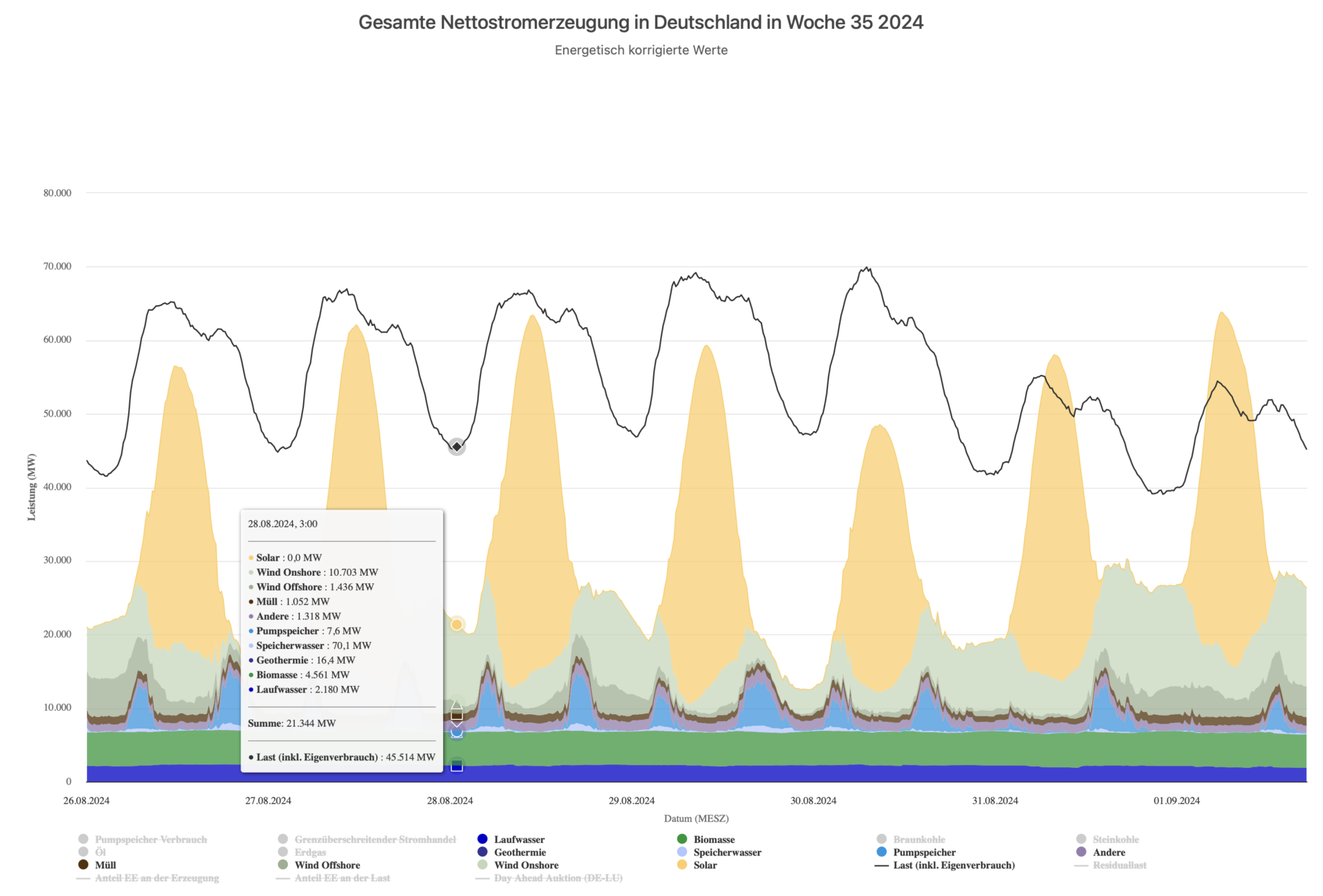 Bei solchen Analysen werde ich in den sozialen Medien regelmäßig angegriffen: Ich würde mir die für meine Aussagen passende Wochen aussuchen – in den anderen Wochen sei alles anders. Jetzt könnte ich die Grafiken aller Sommerwochen in den Beitrag hinein kopieren. Viel einfacher ist es, auf Energy Charts einfach schnell durch die einzelnen Wochen des Sommers durchzuklicken. Schnell kann man da feststellen, dass die oben geschilderte Situation überhaupt keine Ausnahme ist: