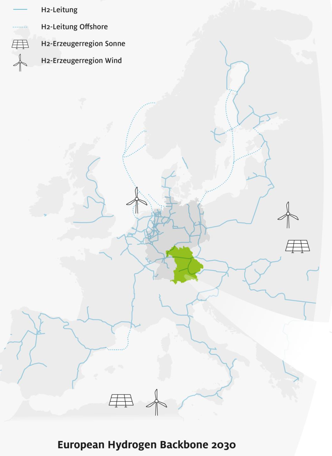 Die Aktivitäten zum Transport von Wasserstoff in Pipelines steigen gerade sprunghaft an, wie das ein aktueller Bericht sehr gut zusammenfasst. Die beiden Karten unten geben schöne Einblicke über die Herkunft des Wasserstoffs und dessen regionale Verteilung (Quelle: Projekt HyPipe Bavaria; bayernets).