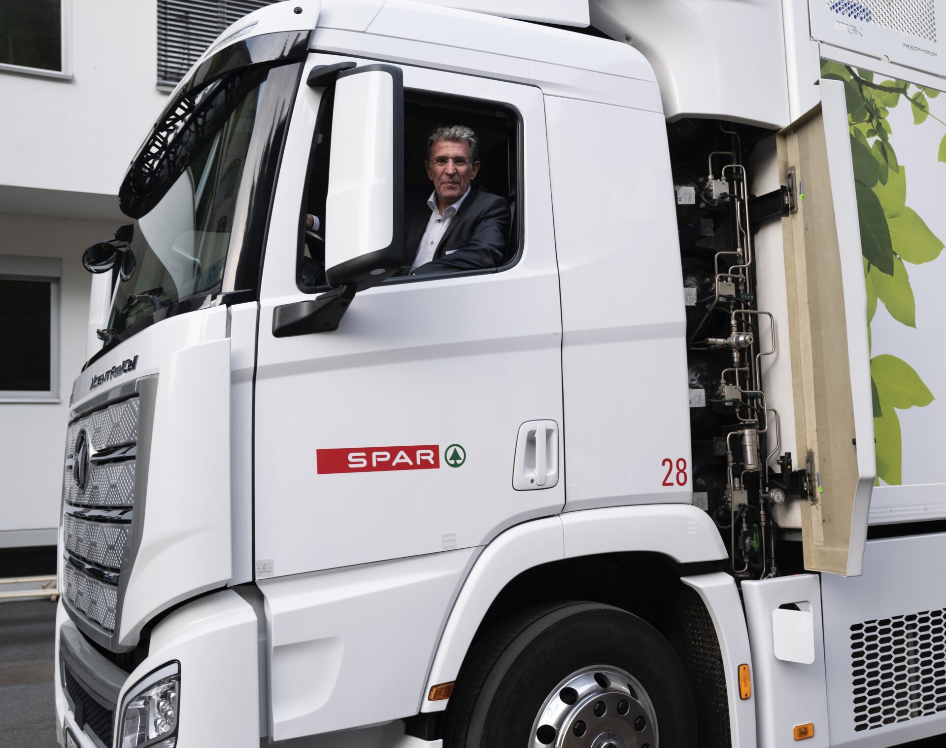 Jean-Marie ist Lastwagenfahrer bei der Schweizer Supermarktkette Coop und fährt seit über drei Jahren mit einem Wasserstoff-Lkw durch die Schweiz.