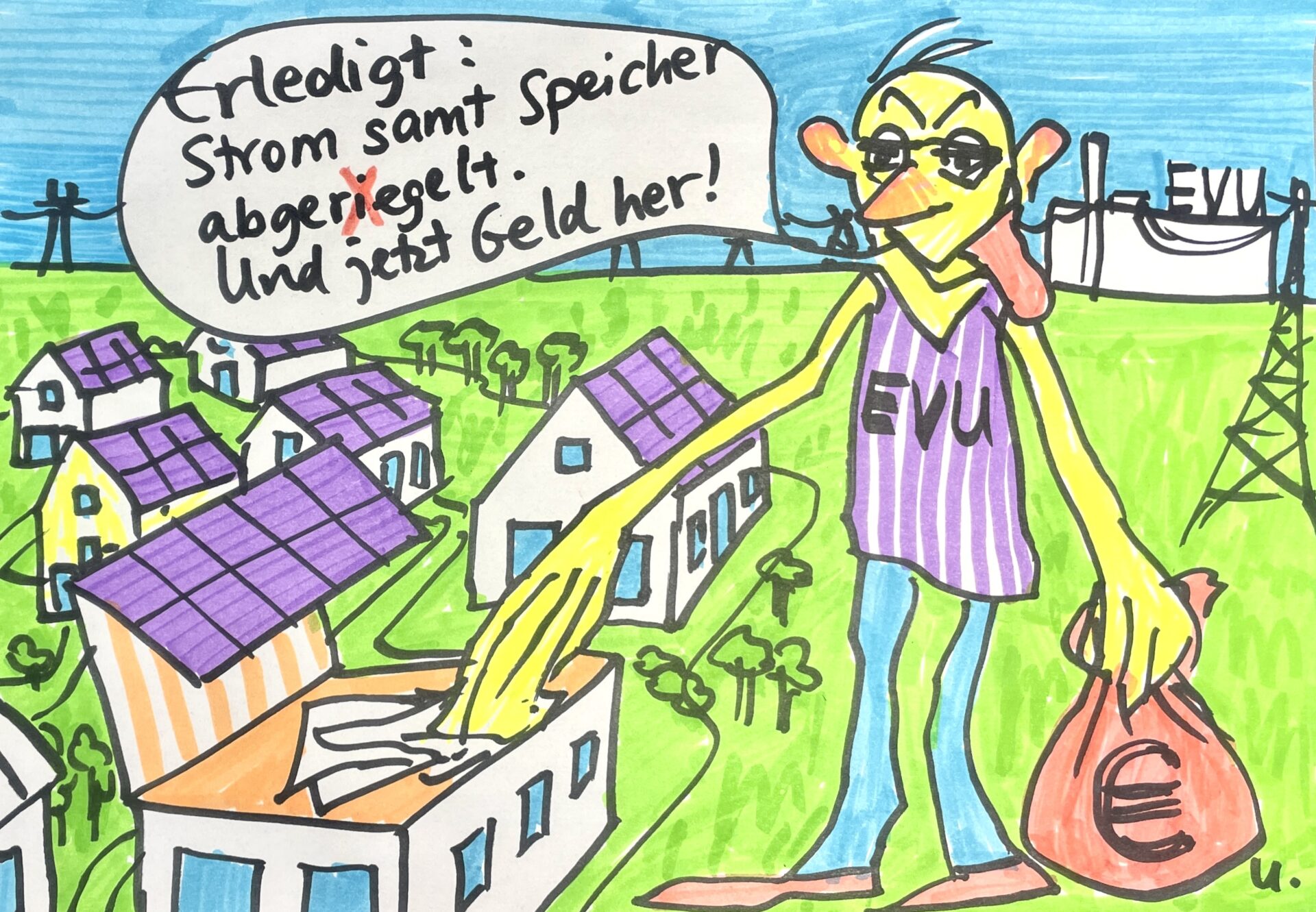In Deutschland sind also gerade diejenigen die „Gelackmeierten“, die sich ganz im Sinne der Energiewende mit Sonnenstrom versorgen und auch noch einen Speicher für die Nacht angeschafft haben. Nur hier – und anders als in der sonstigen EU – haben die Netzbetreiber soviel Zugriff auf fremdes Eigentum. Dabei wollen ja die meisten Anwender von PV im Sinne des Klimawandels doch ihren eigenen Strom gar nicht unbedingt ins Netz einspeisen, sondern vor allem selbst verbrauchen. Das ist aber nicht im Sinne der Netzbetreiber, denn den Strom zu transportieren bringt viel Geld.