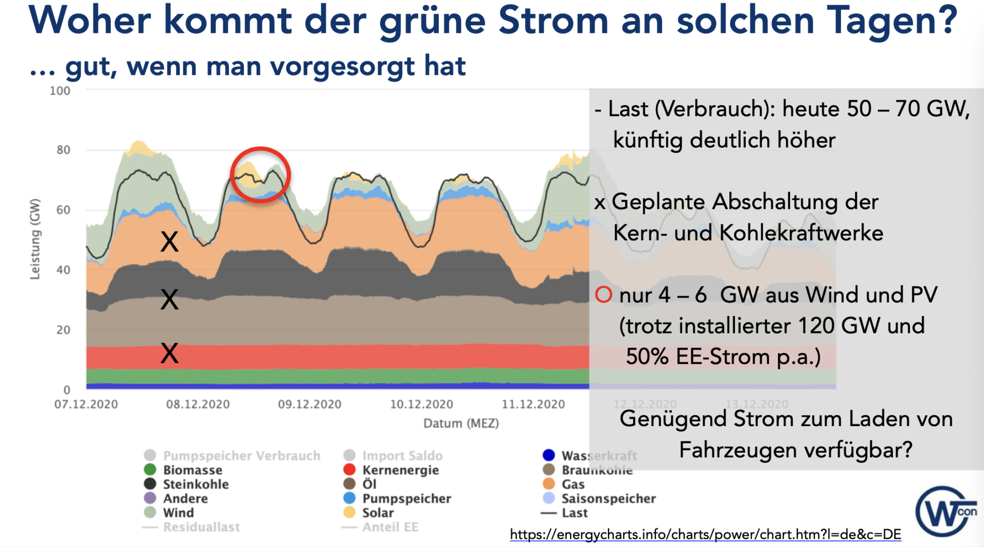 Die Grafik zeigt sehr schön, dass wir heute, trotz der 120 Gigawatt installierter Leistung bei Photovoltaik und Windenergie, an vielen Tagen nur 5 -10 Gigawatt Strom aus Wind und Sonne erzeugen können. Der ganz große Rest kommt aus Kohle, Erdgas und Kernkraftwerken. Letzere werden in zwei Jahren in den Ruhestand gehen. Auch die fossilen Kraftwerke müssen zügig abgeschaltet werden, wenn wir die Klimaziele 2030 erreichen wollen.